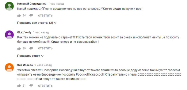 "Хотела видеть Россию в финале. Думала, может чудо произойдет. Но увы. И тут никакая не политика. Просто печальное выступление. Люди же не глухие и не слепые. Не нужно брать жалостью, нужно просто уметь петь", - высказался пользователь.