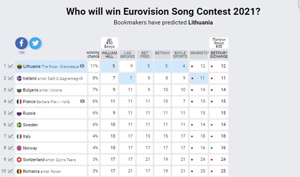 На данный момент самые большие шансы на победу в международном песенном конкурсе у Литвы, Исландии и Болгарии.