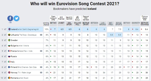 На данный момент самые большие шансы на победу пророчат исландской группе Daði & Gagnamagnið, хотя конкурсную композицию они еще не представили. На втором месте – литовский бэнд THE ROOP с песней Discoteque, на третьем – Швеция, при том, что ни исполнитель, ни песня страны еще не названы.