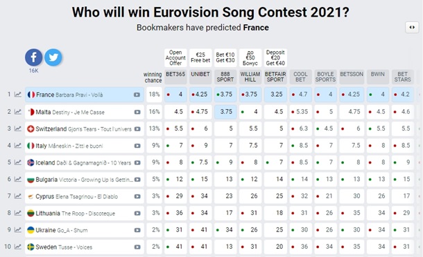 Отметим, что после первой репетиции рейтинг начал быстро меняться и тройка лидеров теперь выглядит так: Франция (вероятность победы 18%), Мальта (16%), Швейцария (13%).